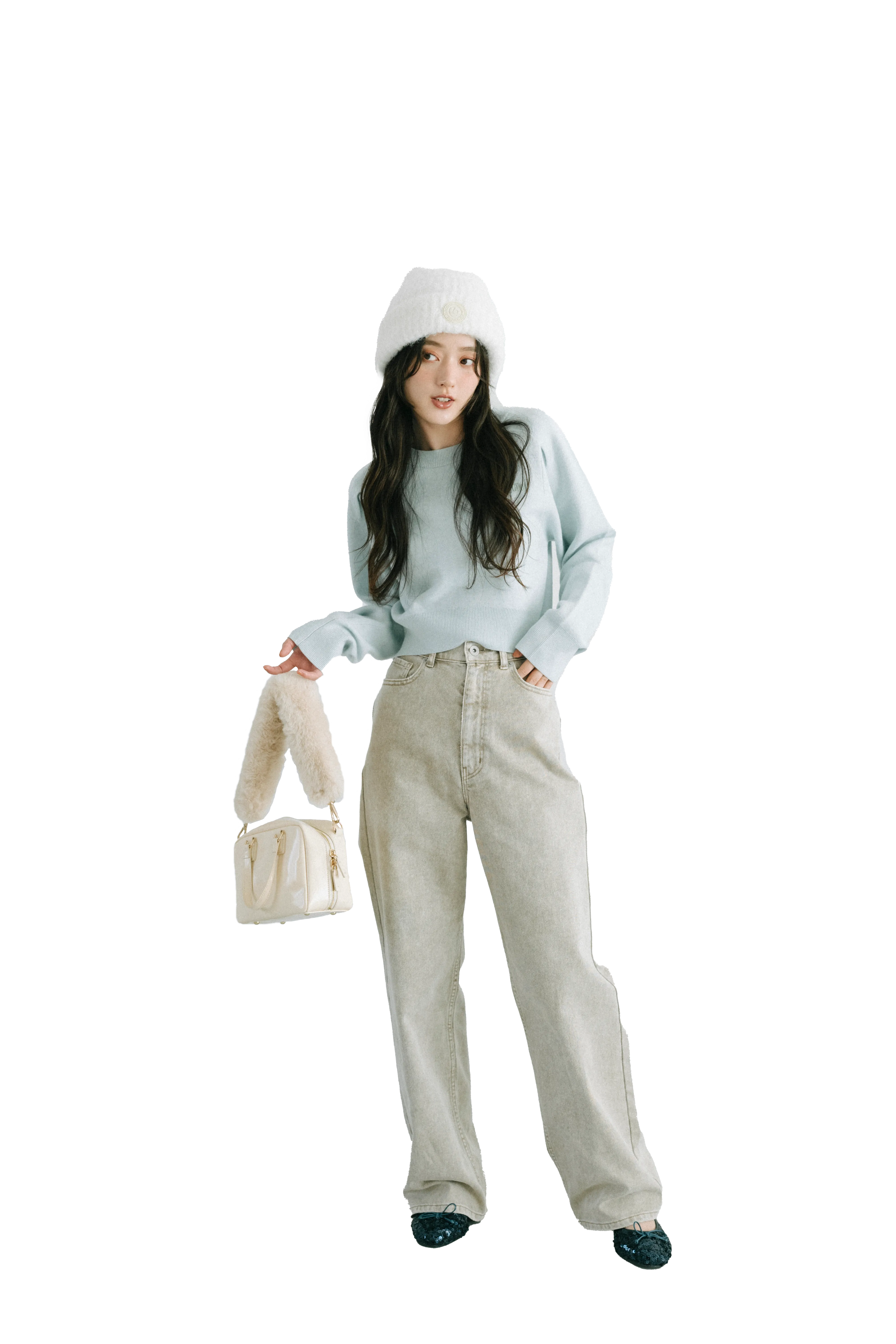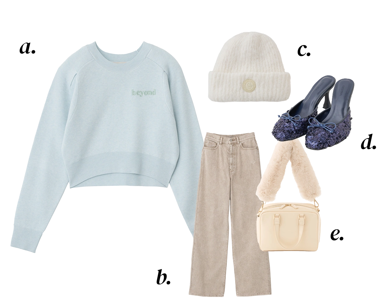 a. Knit ¥8,800 b. Denim ¥13,200 c. Knit hat ¥4,950d. Bag ¥12,100 e. Shoes ¥13,200