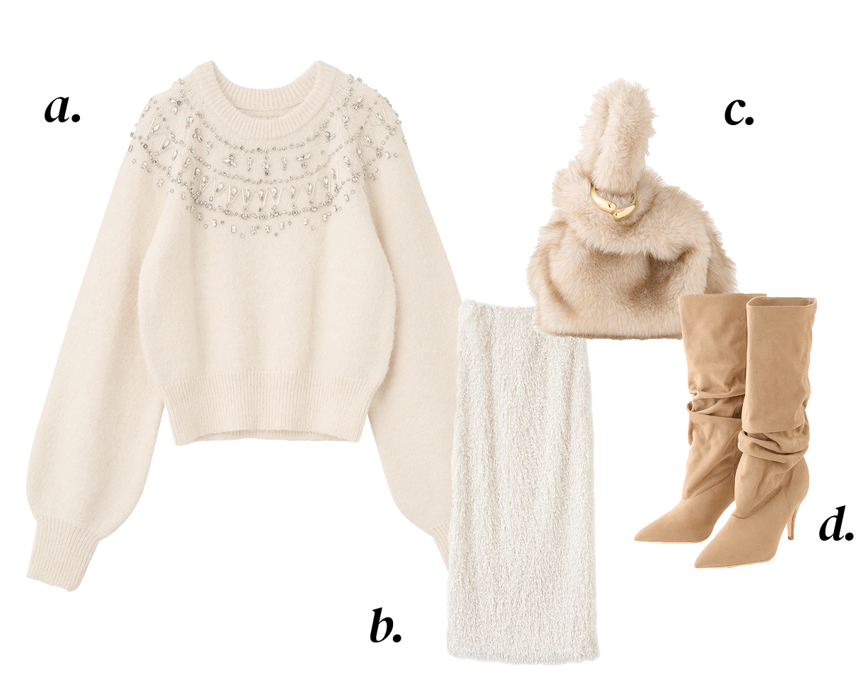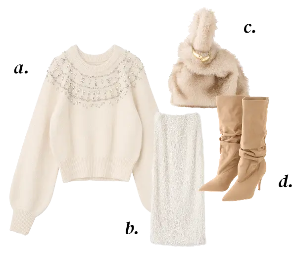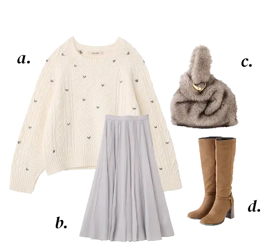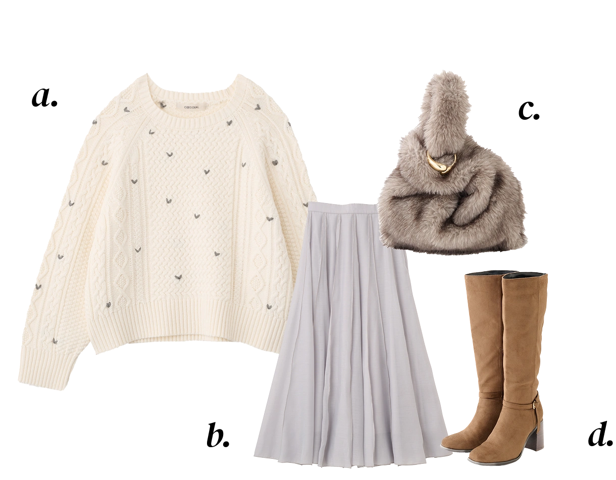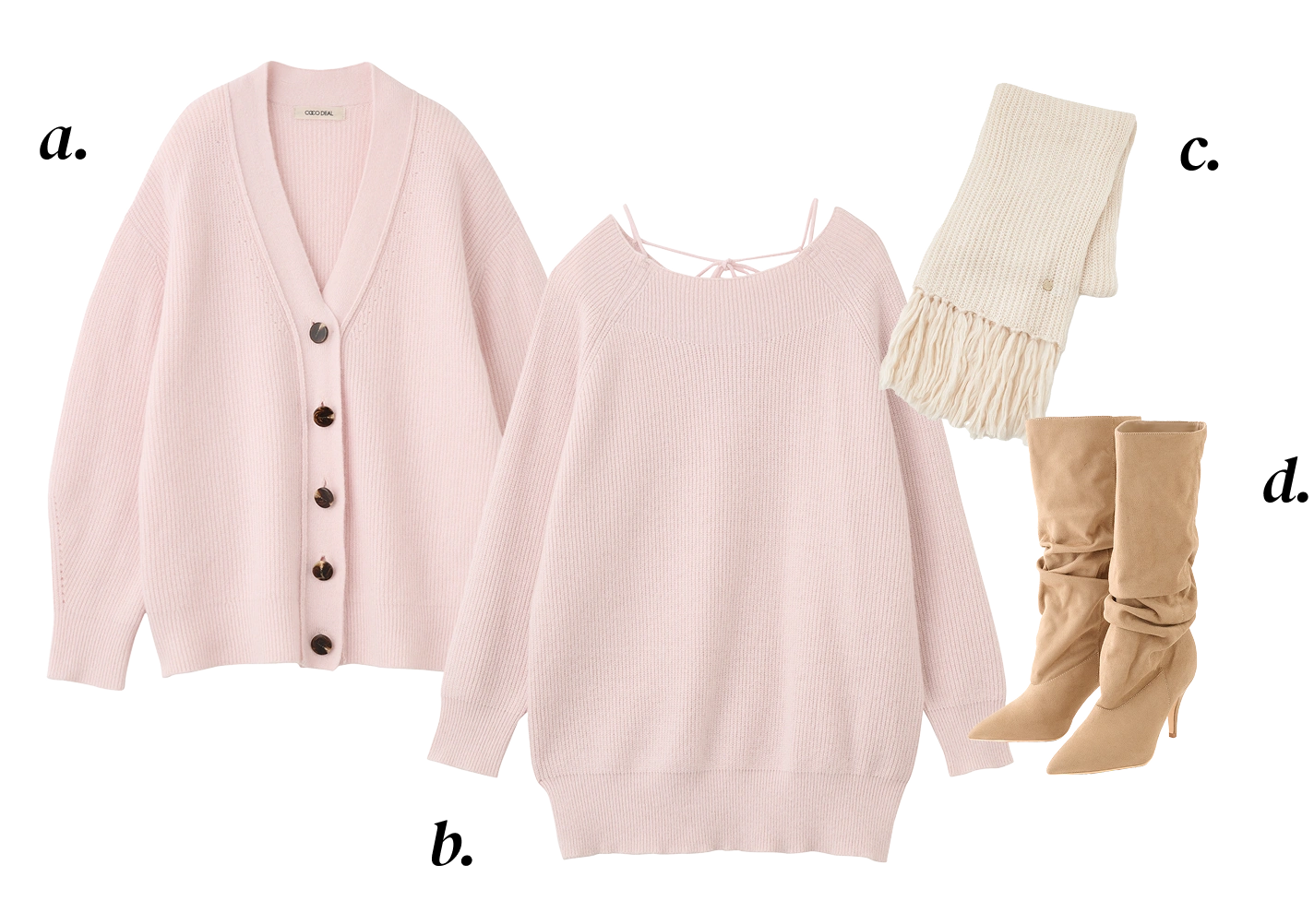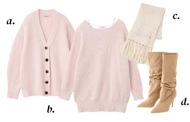 a. Cardigan ¥14,850 b. One-piece ¥16,500c. Muffler ¥4,950 d. Shoes ¥19,800