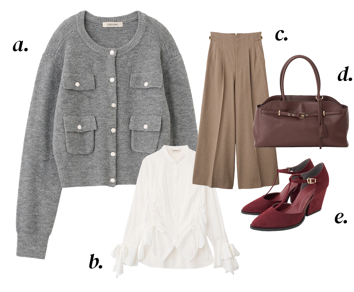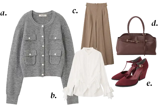 a. Cardigan ¥10,450 b. Blouse ¥9,900 c. Pants ¥13,200 d. Bag ¥14,850 e. Shoes ¥14,300