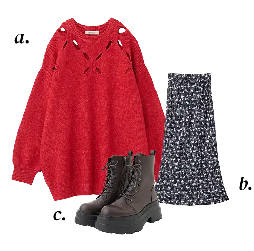 a. Knit ¥12,100 b. Skirt ¥12,100 c. Shoes ¥19,800