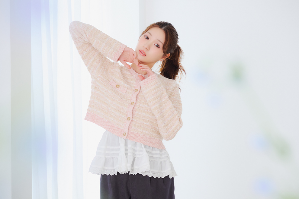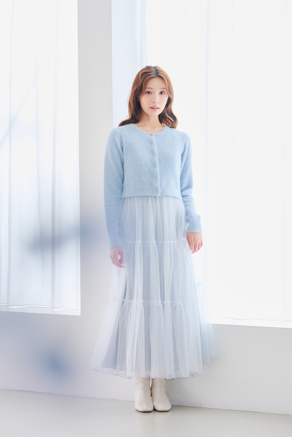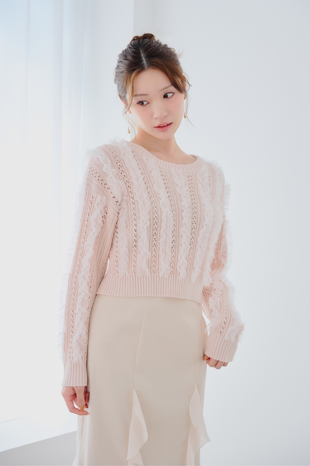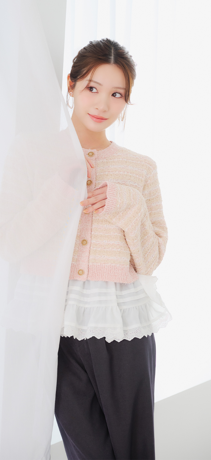 ニットに重ねたチュールが繊細な儚げイメージに。