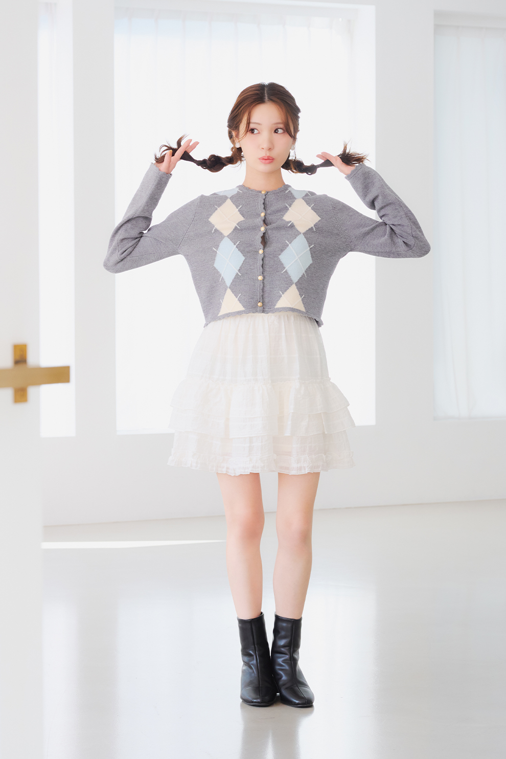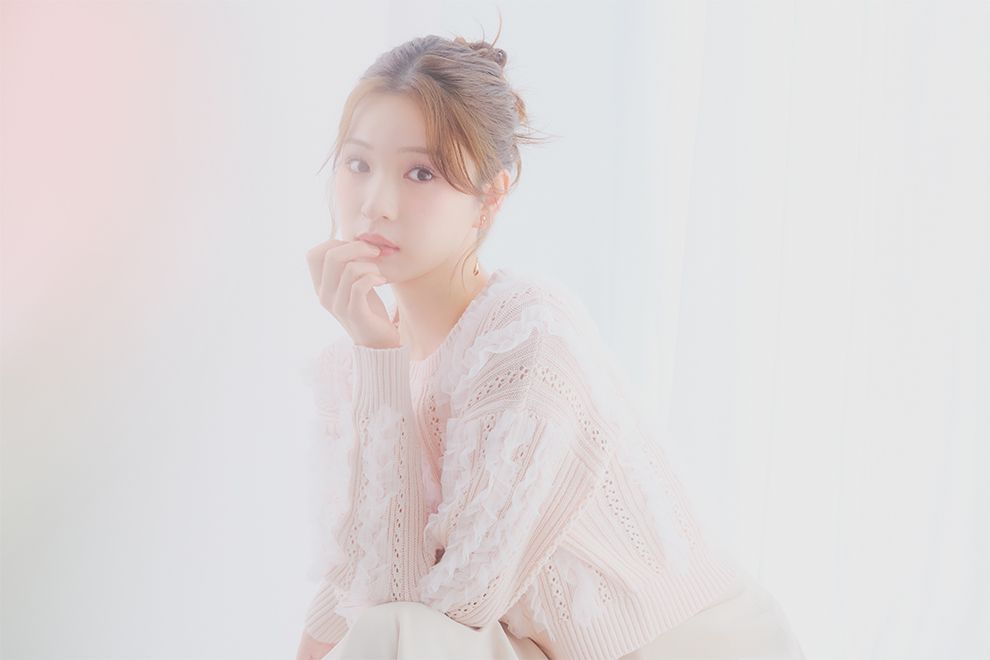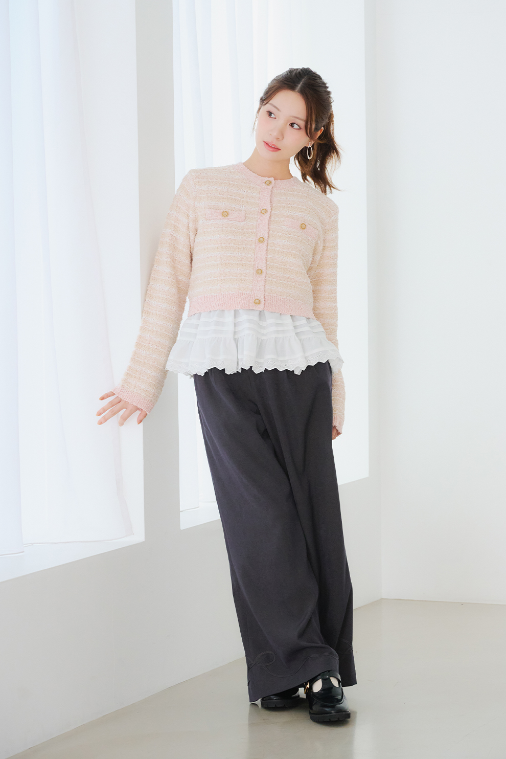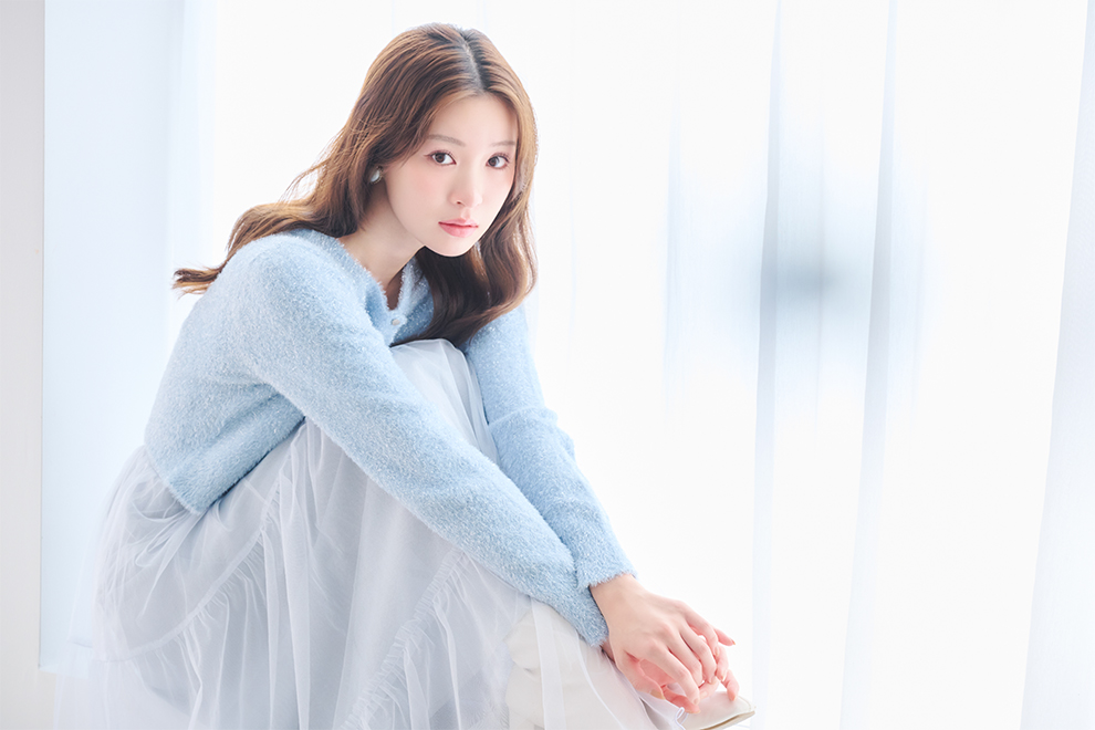 ニットに重ねたチュールが繊細な儚げイメージに。