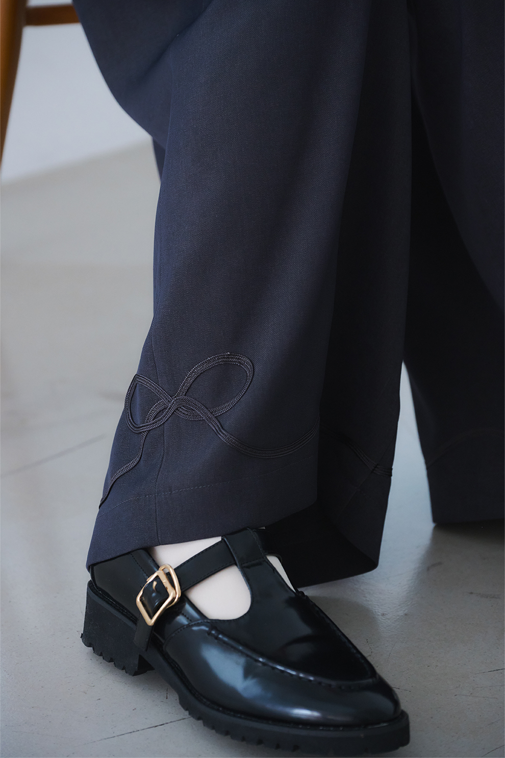 ウエストボタンにリボンのパーツを取り入れ、