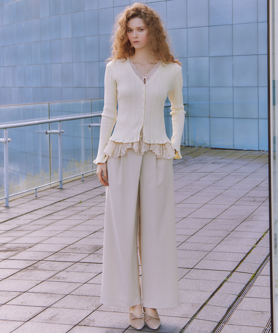 ニットカーデ×レースキャミワンピース